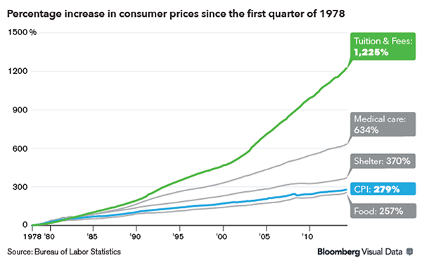 Inflation-adjusted cost of a university education was something like $2000/year in 1980. Now it’s closer to $20,000/year. No, it’s not because of decreased government funding, and there are similar trajectories for public and private schools.