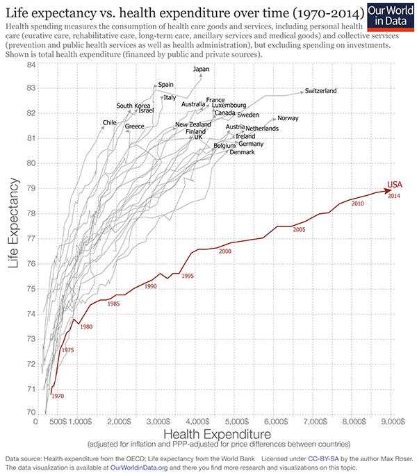 But a lot of people think that life expectancy depends on other things a lot more than healthcare spending. Sanitation, nutrition, quitting smoking, plus advances in health technology that don’t involve spending more money. ACE inhibitors (invented in 1975) are great and probably increased lifespan a lot, but they cost $20 for a year’s supply and replaced older drugs that cost about the same amount.