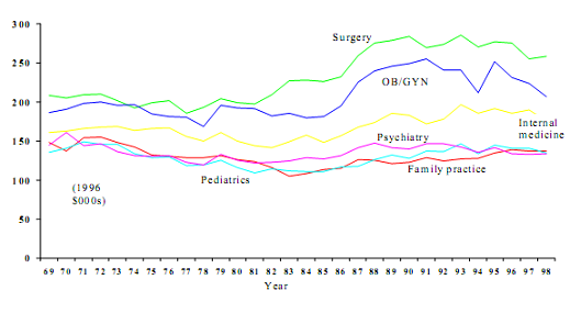 Stable again! Except that a lot of doctors’ salaries now go to paying off their medical school debt, which has been ballooning like everything eles.