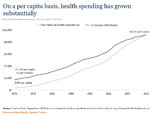 The cost of health care has about quintupled since 1970. It’s actually been rising since earlier than that, but I can’t find a good graph; it looks like it would have been about $1200 in today’s dollars in 1960, for an increase of about 800% in those fifty years.