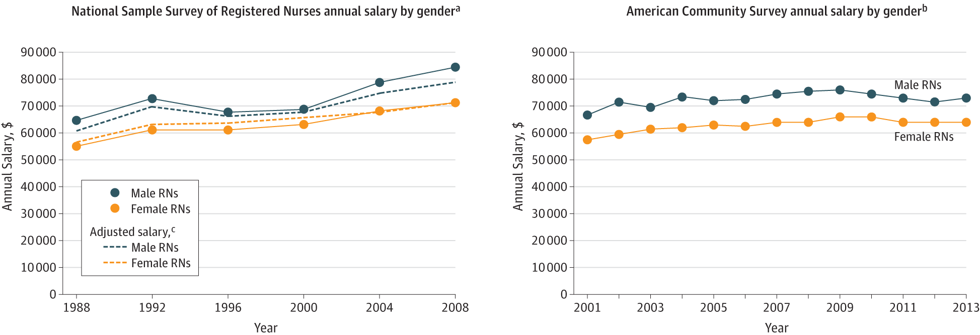 Female nurses’ salaries went from about $55,000 in 1988 to $63,000 in 2013. This is probably around the average wage increase during that time. Also, some of this reflects changes in education: in the 1980s only 40% of nurses had a degree; by 2010, about 80% did.