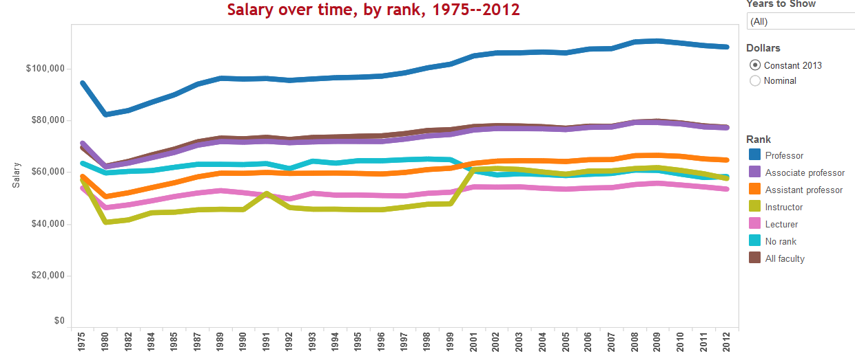Professor salaries are going up a little, but again, they’re probably losing position relative to the average occupation. Also, note that although the average salary of each type of faculty is stable or increasing, the average salary of all faculty is going down. No mystery here – colleges are doing everything they can to switch from tenured professors to adjuncts, who complain of being overworked and abused while making about the same amount as a Starbucks barista.