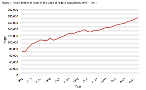 One factor that seems to speak out against this is that starting with Reagan in 1980, and picking up steam with Gingrich in 1994, we got an increasing presence of Republicans in government who declared war on overregulation – but the cost disease proceeded unabated. This is suspicious, but in fairness to the Republicans, they did sort of fail miserably at deregulating things. “The literal number of pages in the regulatory code” is kind of a blunt instrument, but it doesn’t exactly inspire confidence in the Republicans’ deregulation efforts: