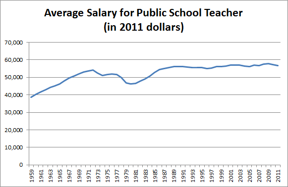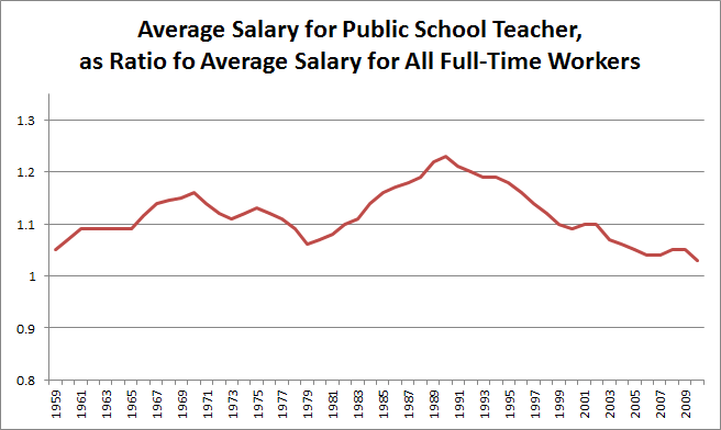 Teacher salaries are relatively flat adjusting for inflation. But salaries for other jobs are increasing modestly relative to inflation. So teacher salaries relative to other occupations’ salaries are actually declining.