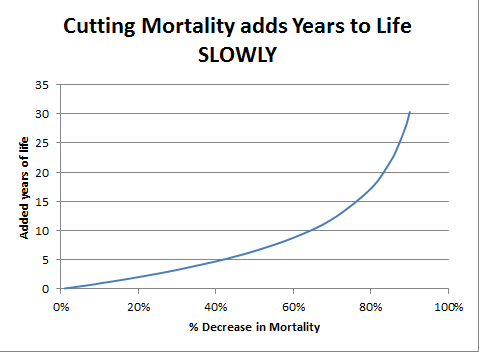 If you’re like me, you want to think “Okay, average life expectancy is eighty years, subtract 20% off of that, and you get 64 years. I’ll live 64 years if I eat bacon every day.” WRONG. Mortality rates are much more complicated, but the key insight is that very few people die when they’re young. If you have approximately a 0% chance of dying at age 30, then adding 20% to 0 is still 0. Chance of mortality creeps upward very slowly and so even large changes in mortality barely affect the underlying distribution. The only good presentation of this I have ever seen anywhere is on Josh Mitteldorf’s blog, which includes the following chart:
