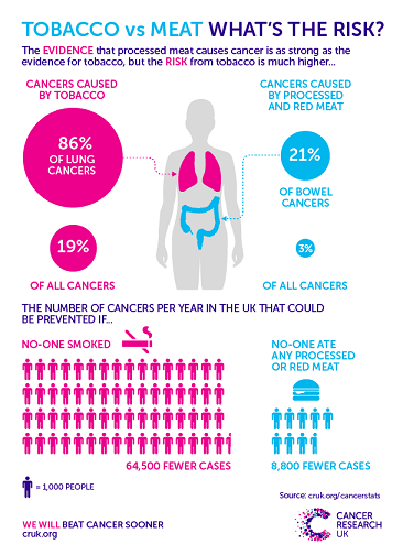 I thought of this the other day when everyone started sharing that study about meat causing colon cancer. A lot of people used headlines like Processed Meats Rank Alongside Smoking As Cancer Causes. This was very correctly debunked by infographics like this one: