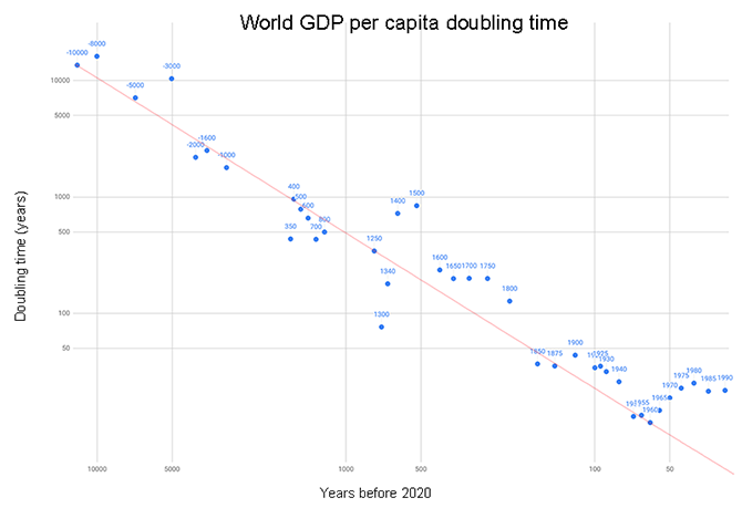 This is a really sketchy graph of per capita income doubling times. It’s sketchy because until 1650, per capita income wasn’t really increasing at all. It was following a one-step-forward one-step-back pattern. But if you take out all the steps back and just watch how quickly it took the steps forward, you get something like this.