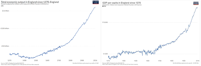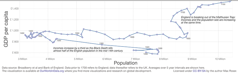 There were always occasional windfalls from exciting discoveries or economic reforms. For a century or two, GDP per capita would rise. But population would always catch up again, and everyone would end up back at subsistence.