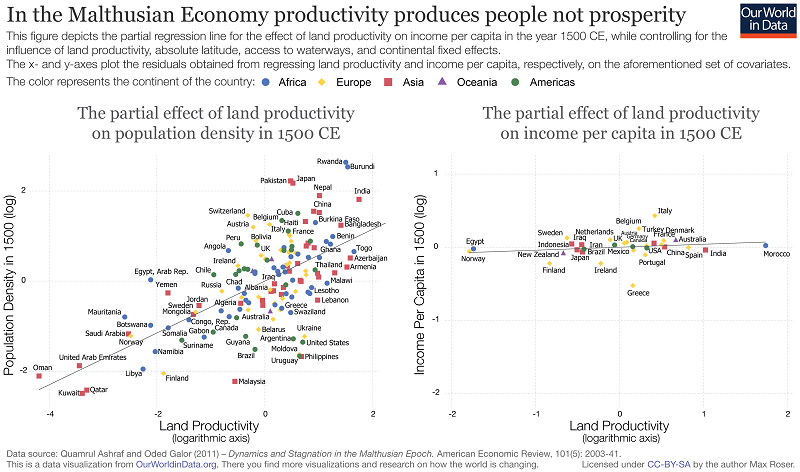 This was the Malthusian trap, where “productivity produces people, not prosperity”. People reproduce to fill the resources available to them. Everyone always lives at subsistence level. If productivity increases, people reproduce, and now you have more people living at subsistence level. OurWorldInData has an awesome graph of this: