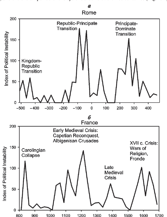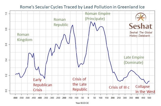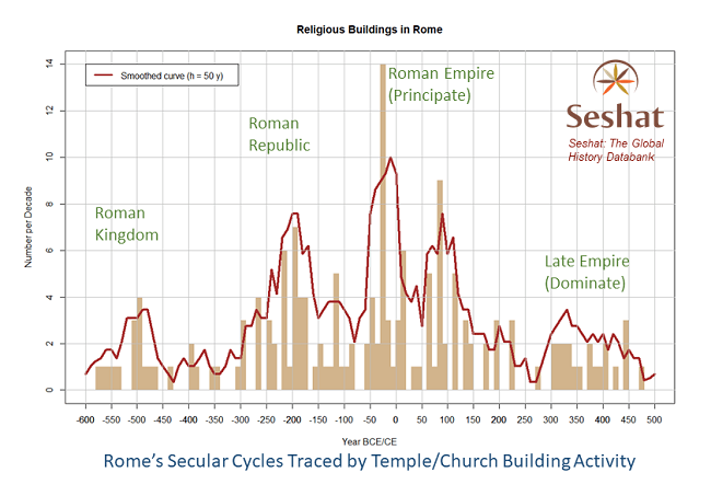 This shows four peaks for the four cycles T&N identify in Rome: the Kingdom, the Republic, the Early Empire of Augustus (Principate, the one described above), and the Late Empire of Diocletian (Dominate). It even shows a sawtooth-y pattern corresponding to the shorter bigenerational cycles.