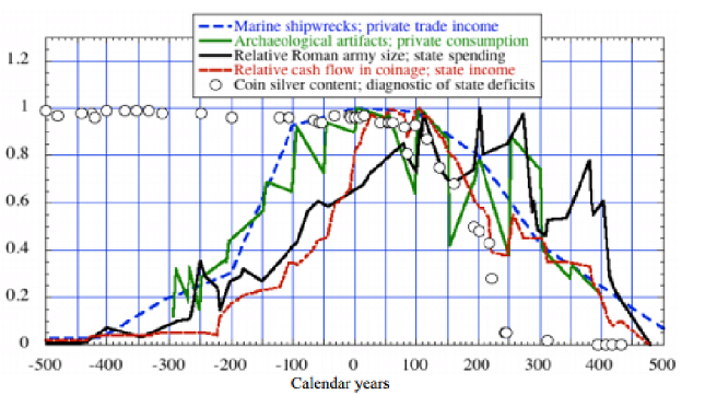 Seeing patterns in random noise is one of the basic human failure modes. Secular Cycles is so prima facie crackpottish that it should require mountains of data before we even start wondering if it might be true. I want to make it clear that the book – plus Turchin individually in some of his other books and papers – provides these mountains. I can’t show every single case study, graph, and table in this book review. But the chapter above on the Roman Principate included 25 named figures and graphs, plus countless more informal presentations of data series, from “real wages of agricultural laborers in Roman Egypt during the second century” to “mean annual real land rents for wheat fields in artabas per aroura, 27 BC to 268 CE” to “imperial handouts per reign-year” to “importation of African red slip ware into the Albegna Valley of Etruria, 100 – 600”. And this is just one chapter, randomly chosen. There are seven others just like this. This book understands the burden of proof it is under, and does everything it can to meet it.