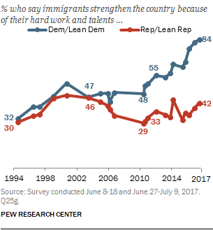 Okay. I admit this is a question about hard work and talents, which is a factual question. But we both know that you would get basically the same results if you asked “IMMIGRATION GOOD OR BAD?” or “DO IMMIGRANTS HAVE THE SAME RIGHTS TO BE IN THIS COUNTRY AS THE NATIVE BORN?” or whatever. And what we see is that this is totally contingent and dependent on the politics of the moment. Of all those liberals talking about how they can’t possibly comprehend conservatives because being against immigration would just require completely alien values, half of them were anti-immigrant ten years ago. Of all those conservatives talking about how liberals can never be convinced by mere debate because debate can’t cut across fundamental differences, they should try to figure out why their own party was half again as immigrant-friendly in 2002 as in 2010.