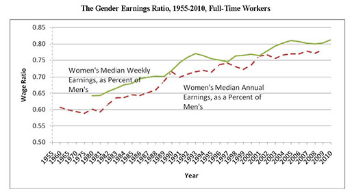 Here’s the black-white income gap over time from 1974 to (almost) the present. Over those years, white oppression of black people has decreased drastically. It is not gone. But it has decreased. Yet the income gap stays exactly the same. Compare this to another example of an oppressed group suddenly becoming less oppressed: