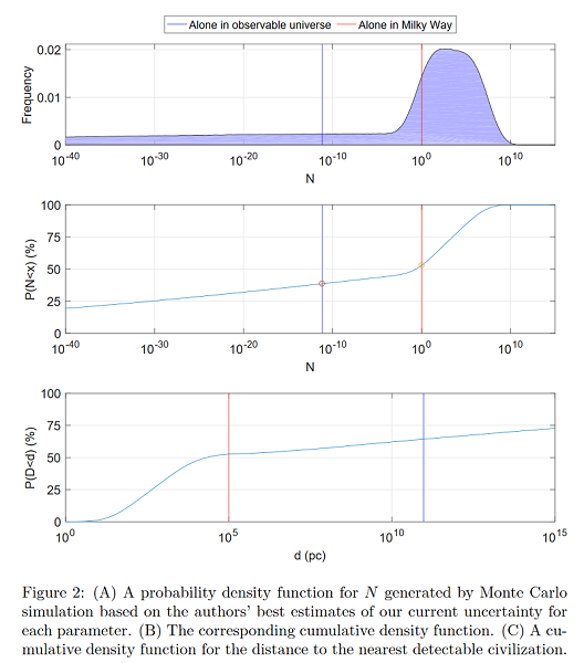 According to their calculations, a standard Drake Equation multiplying our best estimates for every parameter together yields a probability of less than one in a million billion billion billion that we’re alone in our galaxy – making such an observation pretty paradoxical. SDO’s own method, taking account parameter uncertainty into account, yields a probability of one in three.